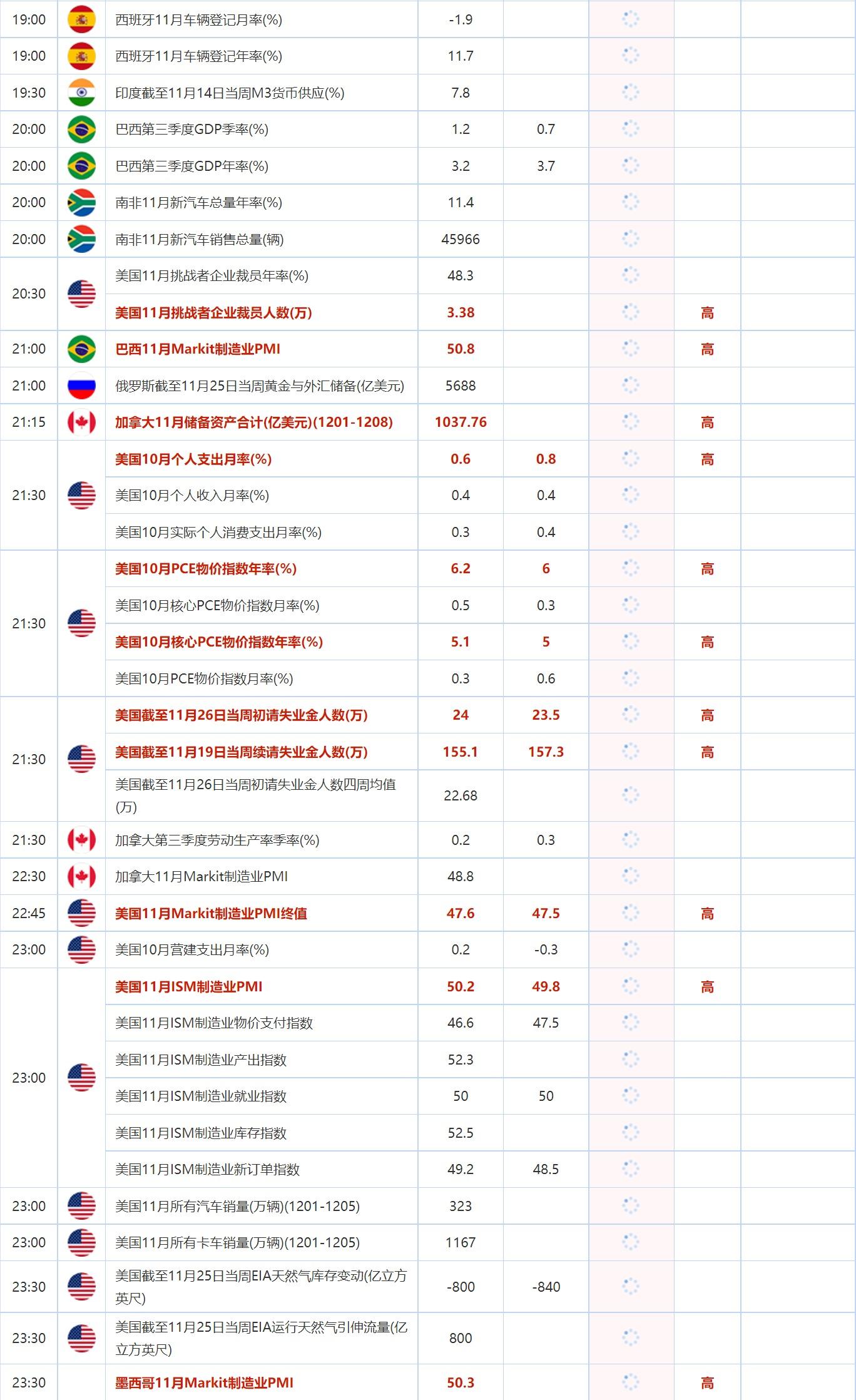 23:00?美国11月ISM制造业PMI?,?前值?50.2?,?预期值?49.8?,?公布值:待发布