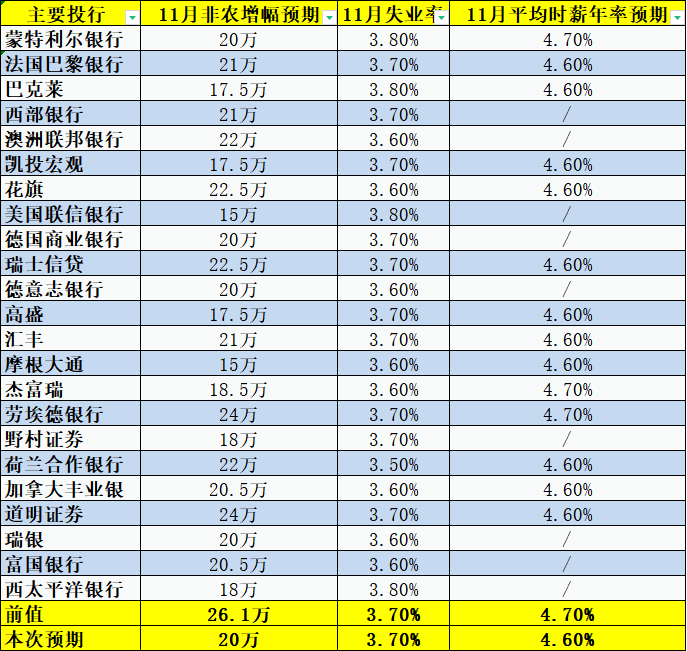 23家大型投行预测显示,主要投行认为11月非农增速进一步下滑,但投行之间的增幅预期差距较大。具体而言,美国11月季调后非农就业人口增幅料介于15万-24万(前值26.1万),失业率料介于3.5%-3.8%(前值3.7%),平均时薪年率增幅料介于4.6%-4.7%(前值4.7%)。