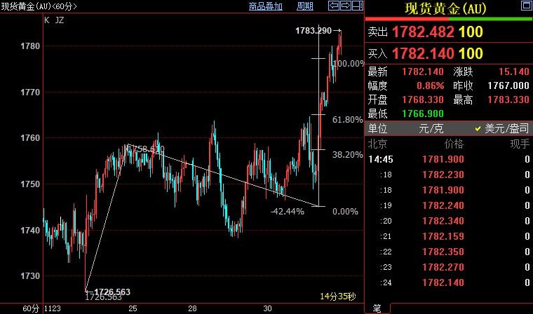 北京时间20:17,现货黄金上涨0.77%至1781.86美元/盎司;美元指数下跌0.50%至105.464。