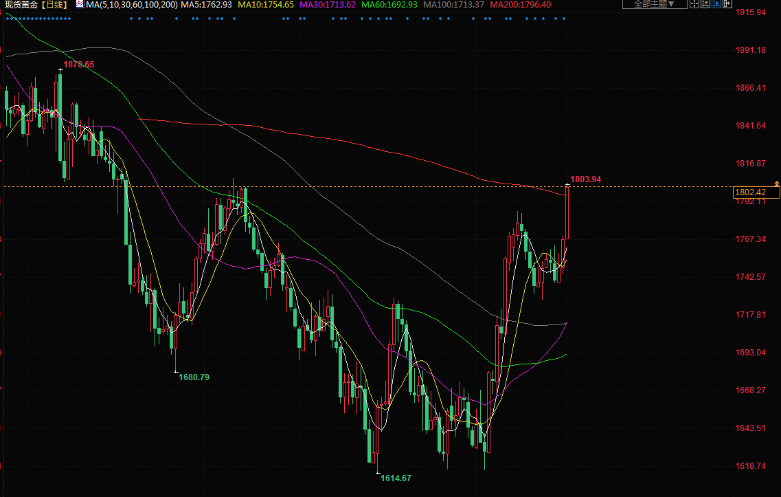 现货金攀升1.8%,至每盎司1800.69美元,稍早曾触及1803.94美元的8月10日以来最高。?