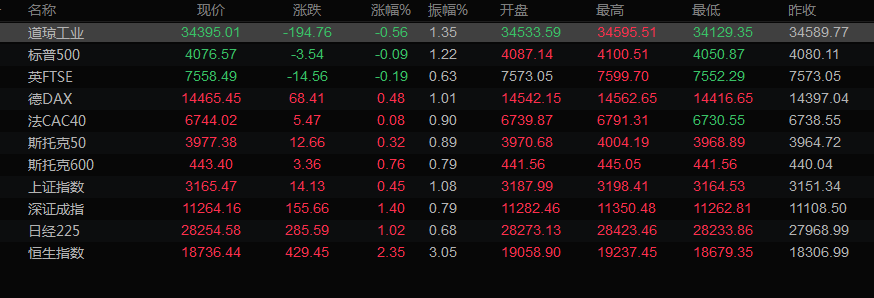 美股收盘情况:?标普500指数下跌0.08%,收报4076.79点。纳斯达克指数上涨0.13%,至11482.45点,????道琼斯工业指数下跌0.56%,至34396.53点。