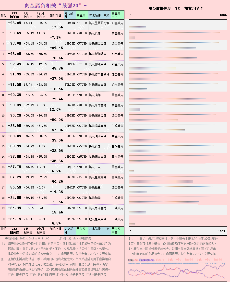 ★贵金属VS外汇的负相关最强前三个分别是:美元墨西哥比索(USDMXN)?VS?铂金美元(XPTUSD)的“负相关”强度达到-93.60%。美元泰铢(USDTHB)?VS?黄金美元(XAUUSD)的“负相关”强度达到-93.60%。美元捷克克朗(USDCZK)?VS?铂金美元(XPTUSD)的“负相关”强度达到-93.00%。汇通网提醒,更多参考本文如下表格。