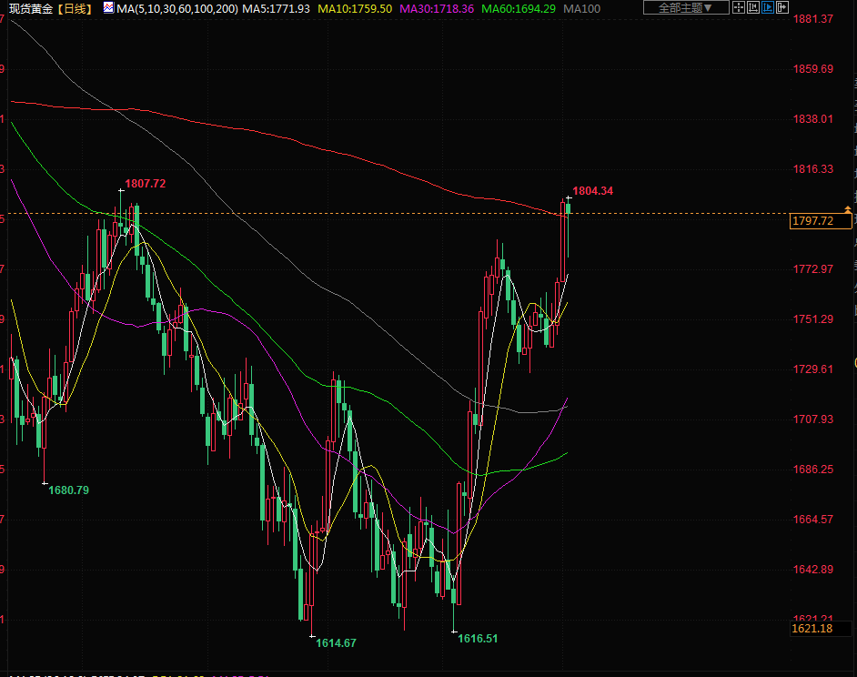 现货金下跌0.4%,至每盎司1794.96美元,稍早触及8月10日以来最高的1804.46美元。