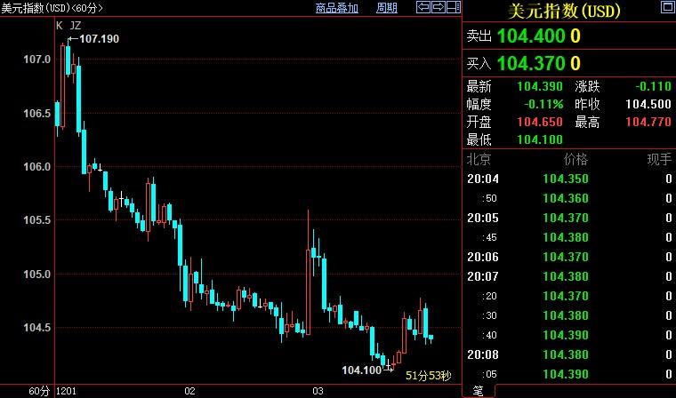 北京时间20:07,现货黄金下跌0.18%至1794.46美元/盎司;COMEX期金主力合约下跌0.10%至1807.7美元/盎司;美元指数下跌0.10%至104.394。