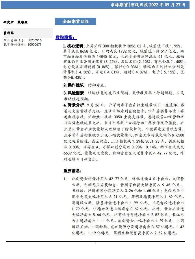 标题:【东海期货9月27日金融期货日报】:A股三大股指冲高回落,国债期货全线收跌