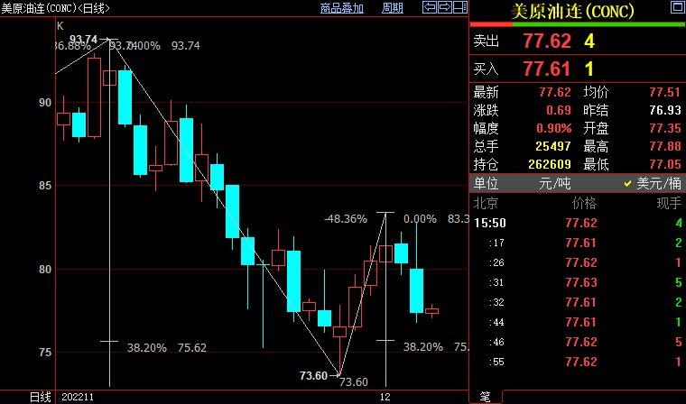 北京时间15:53,NYMEX原油期货上涨0.84%至77.58美元/桶;ICE布伦特原油期货上涨0.96%至83.48美元/桶。