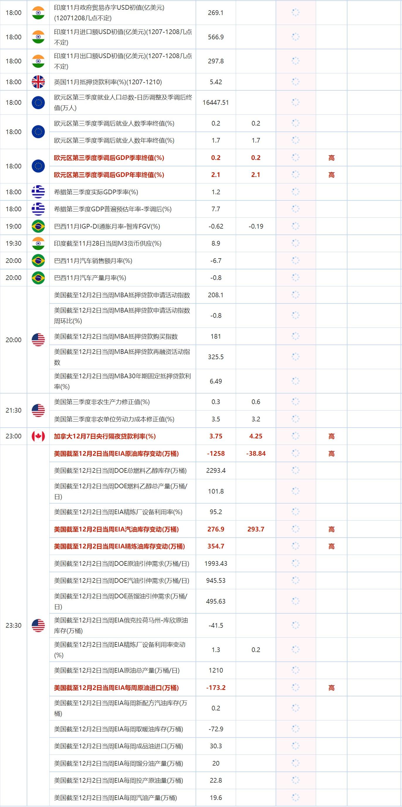 23:00?加拿大12月7日央行隔夜贷款利率(%)?,?前值?3.75?,?预期值?4.25?,?公布值:待发布