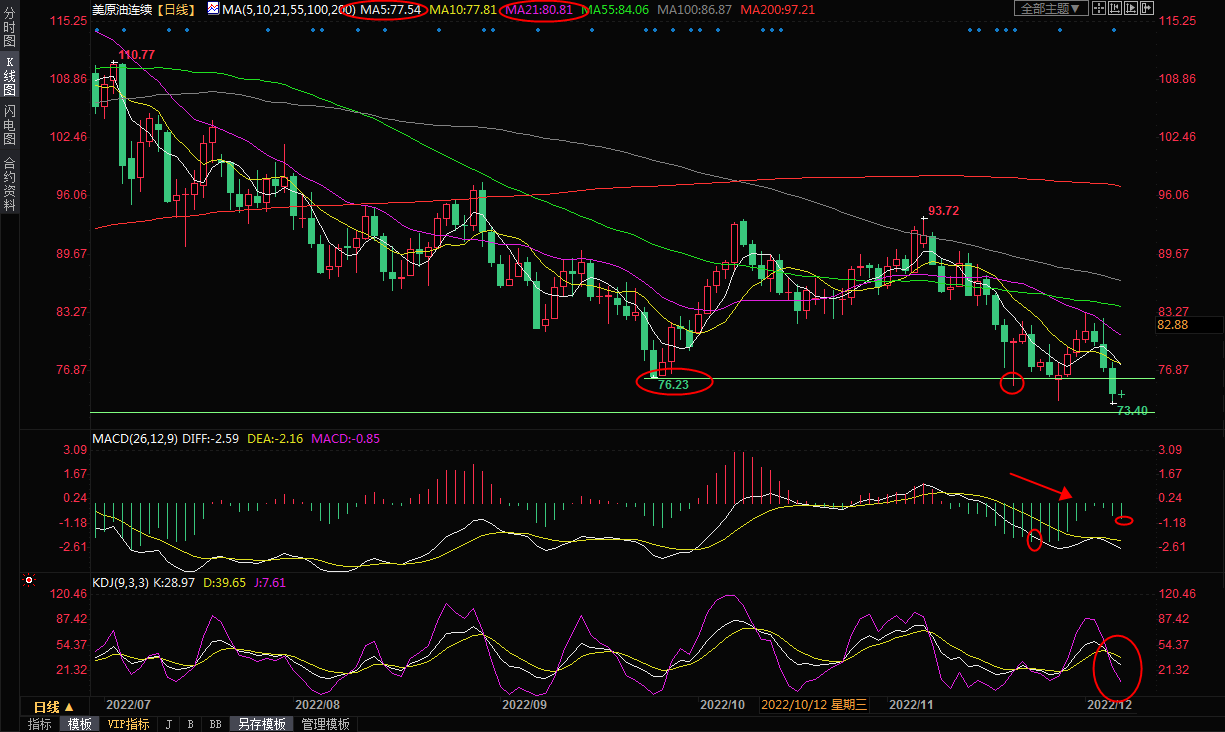 日线级别:震荡下跌;MACD向下发散,KDJ死叉运行,均线空头排列,油价再度跌破了9月份低点76.23附近支撑,在收复该位置前,油价偏向启动新一轮跌势,短线下方已经无明显支撑,隔夜低点支撑在73.34附近,进一步参考2021年12月23日低点72.27附近,70整数关口附近也存在一些心理支撑,较强的支撑在12月20日低点66.12附近;从价格测算来看,油价在中线甚至会跌至60整数关口附近。