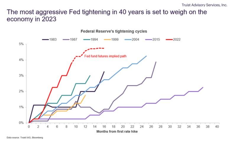 图:美联储40年以来最激进的收紧将令2023年经济承压(上排黑字:美联储收紧周期;下排黑字:首次加息月份;中间红字:联邦基金期货隐含路径)