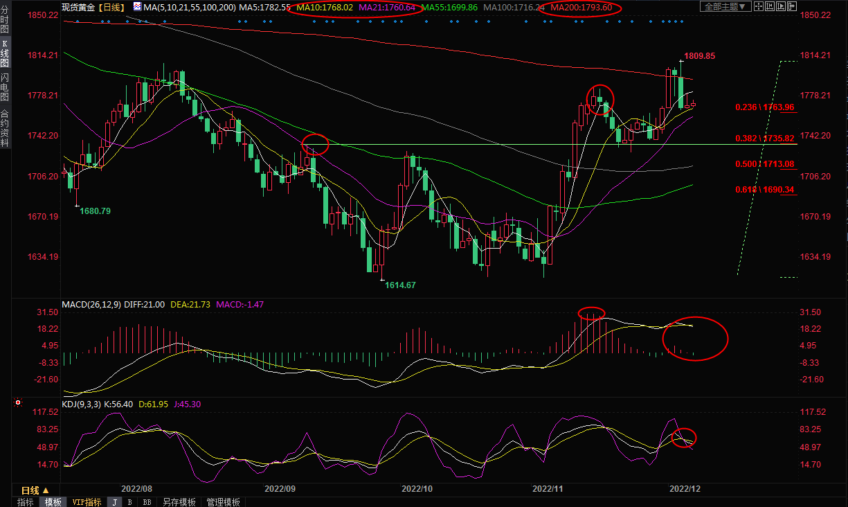 在失守21日均线1760.66前,多头仍有重拾涨势的机会,上方初步阻力在1780整数关口附近,周二高点也在该位置附近,11月15日高点阻力在1786.36附近,200日均线阻力在1793.60附近,若能强势收复该位置,则增加后市看涨信号。