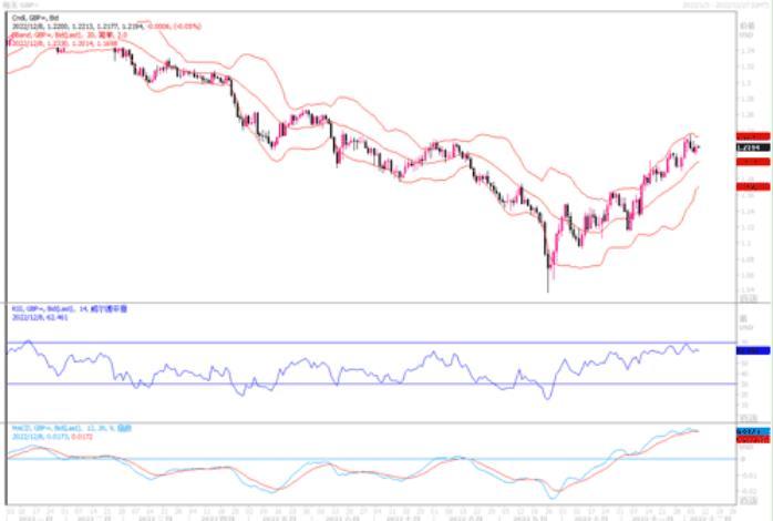 周三(12月7日),欧洲央行管委会委员peter?kazimir暗示其支持下周欧央行会议上连续第三次加息75个基点。他指出,鉴于欧元区的任何经济衰退都可能较为短暂,而通胀率即使在2025年也将依然高于目标水平,官员们应迅速将利率上调至足以令经济活动降温的水平。该委员的发言是对欧央行12月份会议大举加息予以的最强烈支持言论之一。除了利率上调幅度,欧央行官员们还将讨论如何开始到期减持近年来作为刺激措施一部分而购买的约5万亿欧元债券。受欧央行鹰派的态度刺激,在隔夜外汇市场上,欧元继续在震荡中逞强,对美元收盘再回到1.05楼上。欧元昨日反弹日线报收上下影线小阳线,技术指标经前两个交易日回落调整后,下跌倾向有所改善。从4小时图来看,汇价再度攀升回短期均线上方,MACD零轴附近运行,绿色动能柱开始收敛,随机指标KDJ底部交叉上走,显示欧元多头短线内仍将具有韧劲。预料下周利率会议前欧元对美元多空在1.05水平的争夺较为激烈,若汇价能再次彻底企稳1.05上方,则欧元对美元后市有望进一步攀高。