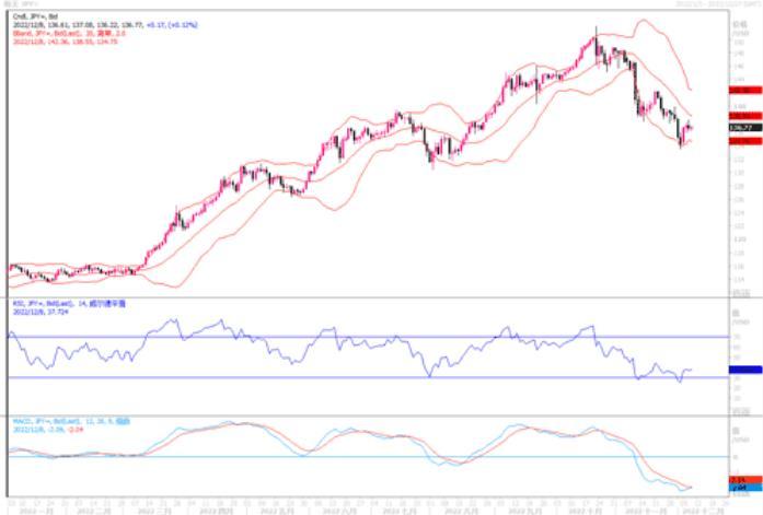 在周三的外汇市场上,美元兑日元日内下跌了0.5%,收盘于136.62。日本最新公布的贸易逆差超过预期达到150亿美元,出口同比增长25.3%低于9月份28.9%的同比增长。且日本第三季度实际GDP年化季环比终值降0.8%,但还是高出预期的-1.1%数值。而且日本央行审议委员中村富明还宣称,宽松货币政策的利大于弊??杉?,日本央行尚无意于改变当前的宽松货币政策。但是,由于近阶段市场对于美元利率峰值即将来临的预期浓烈,因此推动了日元兑美元价值回归交易的产生。日线图上报收上影线小阴线,波动幅度陷入窄幅之中。从4小时图来看,,MACD零轴附近运行,红色动能柱开始收敛,随机指标KDJ开始下行,冲击138不过,美日有重新下行趋向。下方首要支撑136.50-60,第二支撑136.00,若跌穿136.00,下方将会再度往一周前的低点133.63测试。