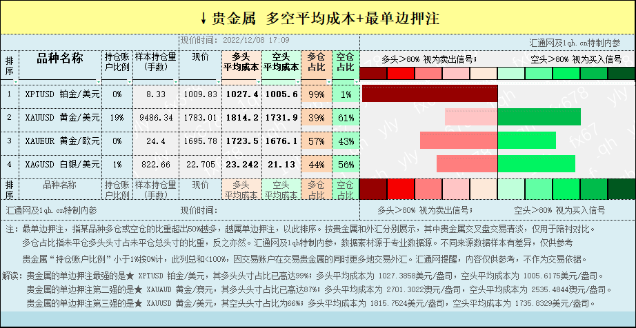 标题:图解贵金属及外汇:多空成本+最单边押注(2022/12/08周四)