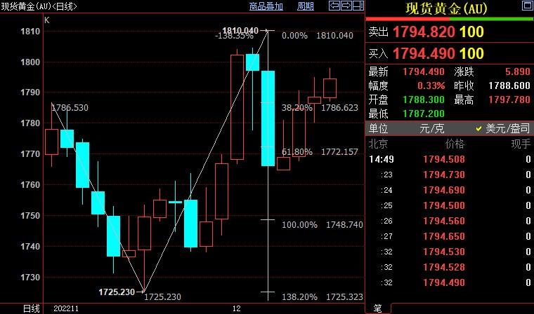 北京时间14:52,现货黄金上涨0.31%至1794.56美元/盎司;COMEX期金主力合约上涨0.30%至1806.9美元/盎司;美元指数下跌0.20%至104.605。
