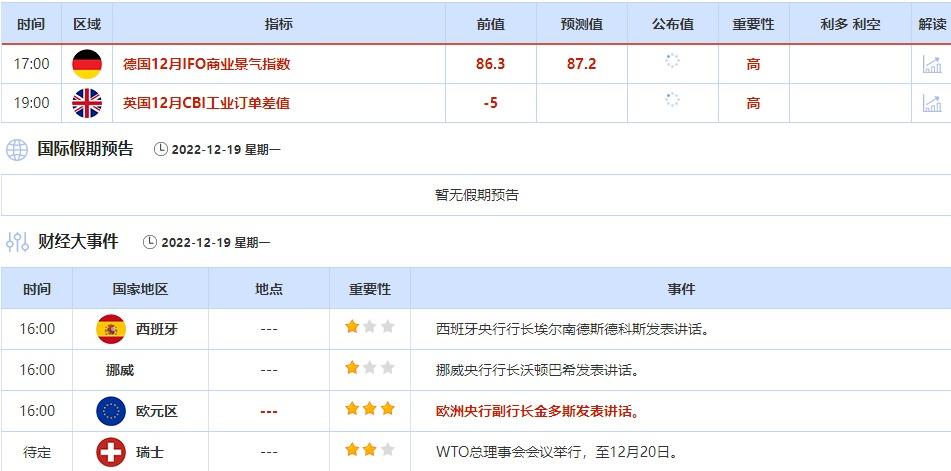 ①12月19日(周一)关键字:德国12月IFO商业景气指数,欧洲央行副行长金多斯?