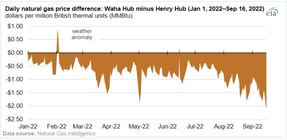 自2021年底以来,西德克萨斯州瓦哈中心和作为美国基准的路易斯安那州亨利港(Henry?Hub)的天然气价格之间的价差就一直在扩大。