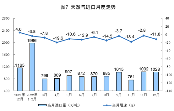 天然气生产增速有所放缓,进口降幅扩大。12月份,生产天然气204亿立方米,同比增长6.5%,增速比上月放缓2.1个百分点,日均产量6.6亿立方米。进口天然气1028万吨,同比下降11.8%降幅比上月扩大9.0个百分点。