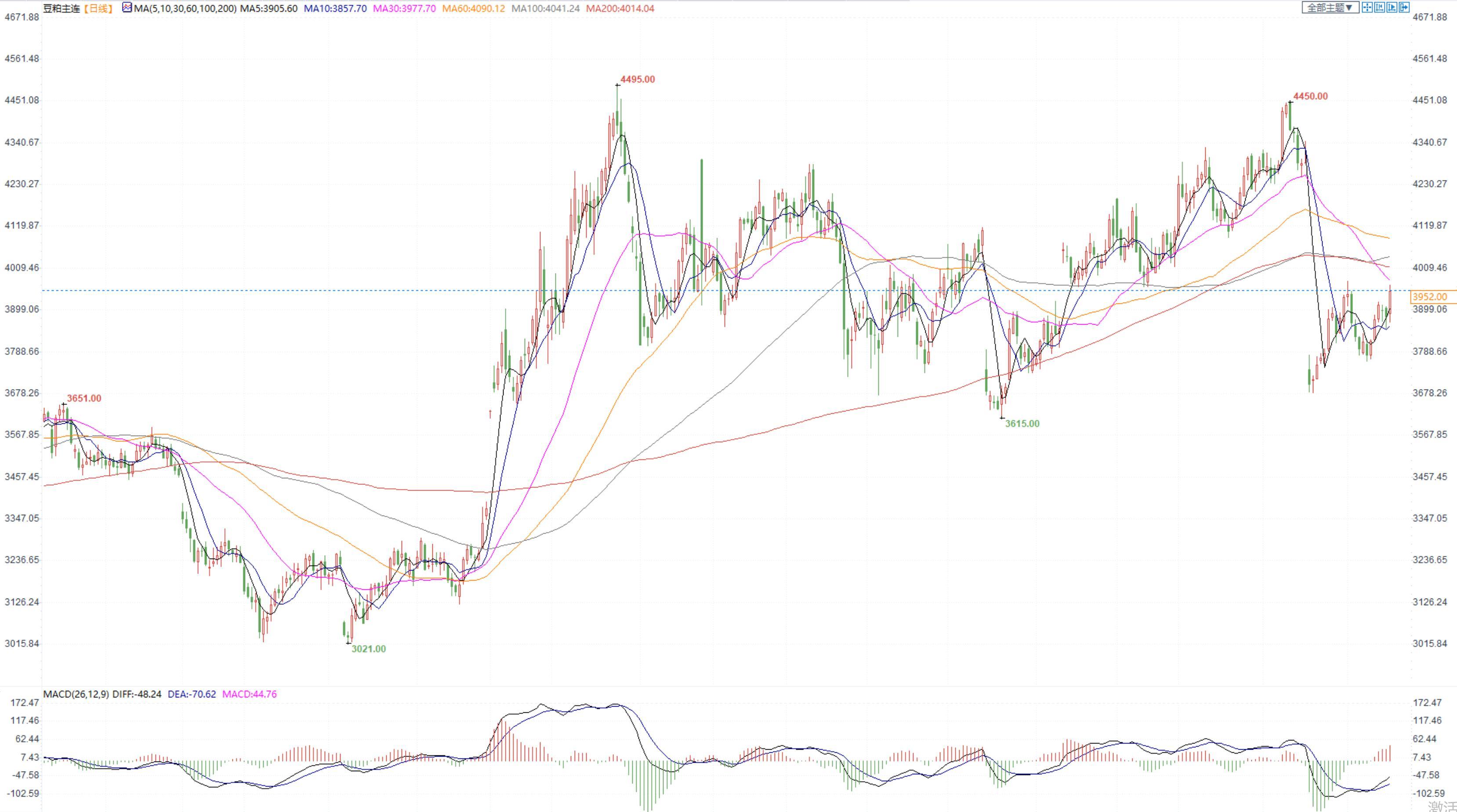 豆粕2305合约日内涨1.88%,收盘价3952元/吨,现货张家港43%蛋白豆粕4655元/吨
