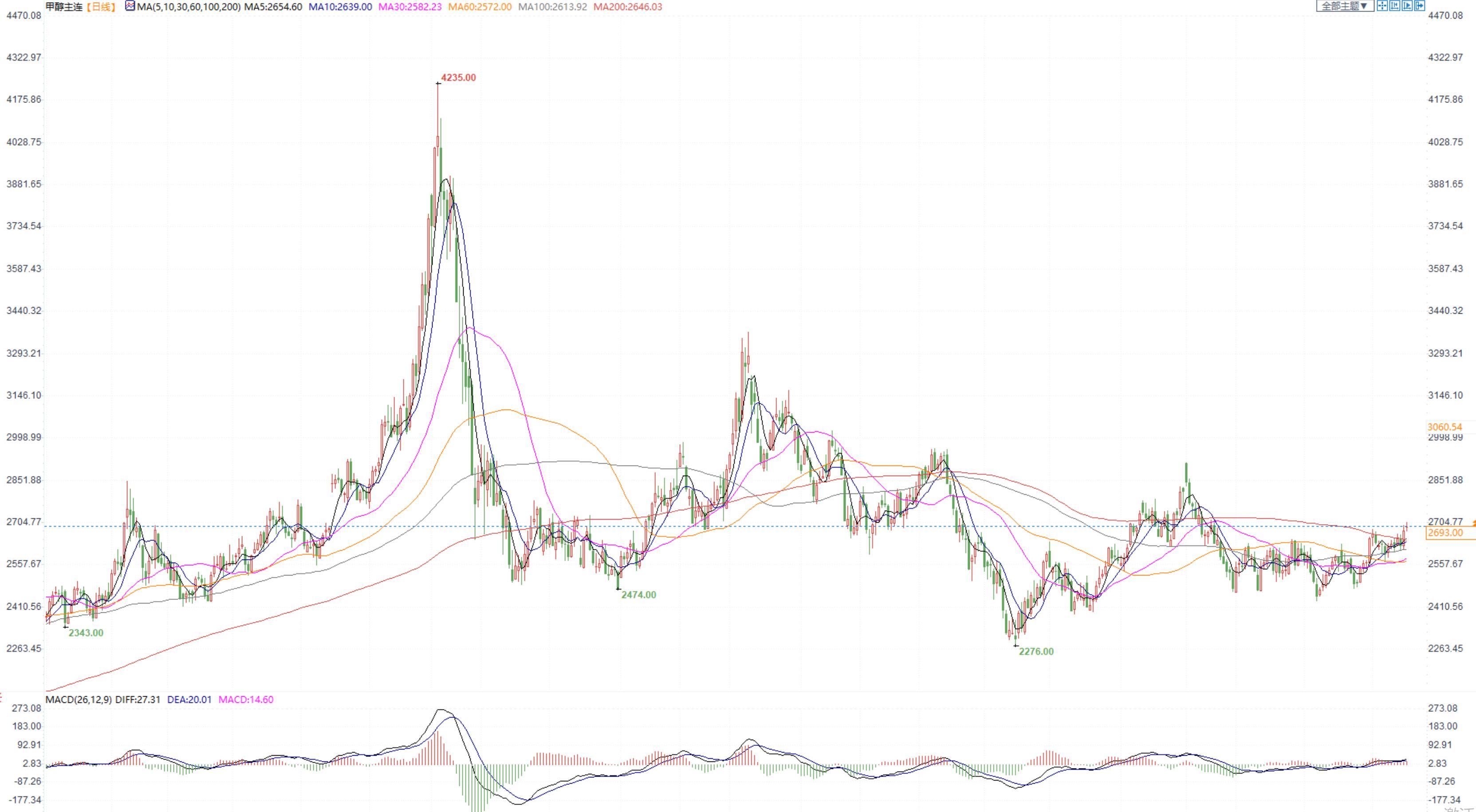 期货市场,甲醇2305合约小幅收涨,收盘价2693。张家港地区参考价格2700-2720元/吨。