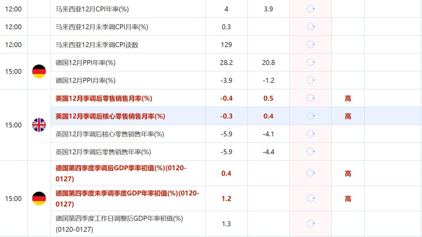 15:00?英国12月季调后核心零售销售月率(%)?,?前值?-0.3?,?预期值?0.4?,?公布值:待发布