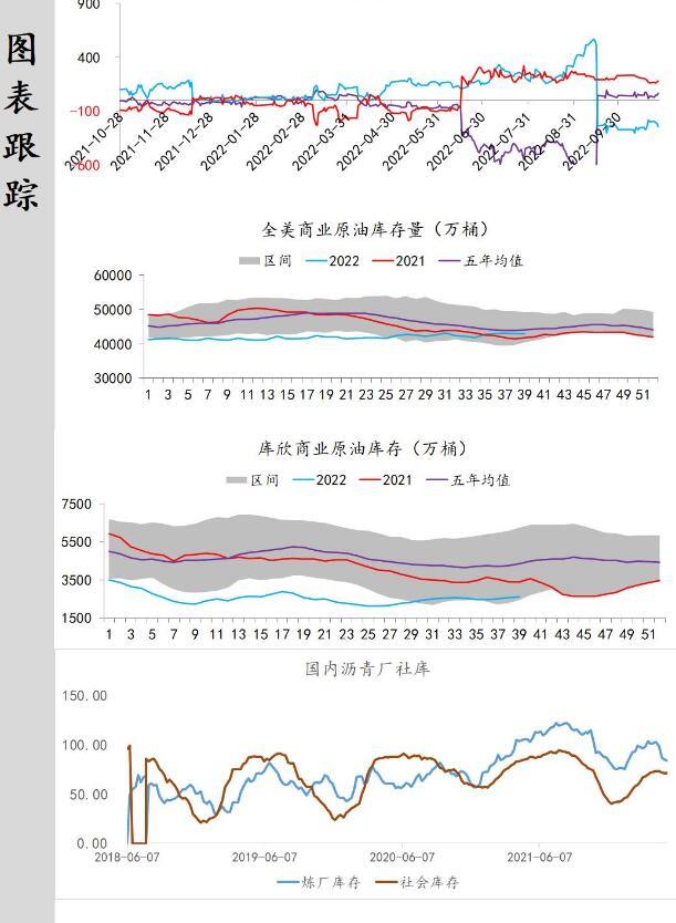 供应端:据美国能源信息署最新数据显示,截止2022年10月21日当周,包括战略储备在内的美国原油库存总量8.41663亿桶,比前一周下降829万桶;美国商业原油库存量4.39945亿桶,比前一周上涨258.8万桶;战略原油库存量4.01718亿桶,比上一周下降341.7万桶;美国汽油库存总量2.0789亿桶,比前一周下降147.8万桶。商业原油库存比去年同期高2.12%,比过去五年同期低1.17%;汽油库存比去年同期低3.64%,比过去五年同期低约6.70%;馏份油库存比去年同期低14.89%,比过去五年同期低20.21%。