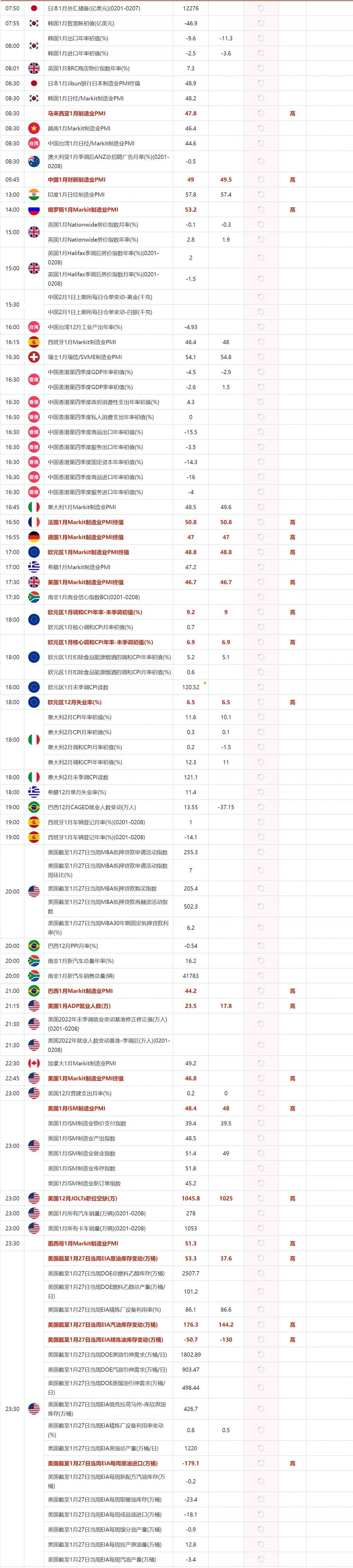 23:30?美国截至1月27日当周EIA每周原油进口(万桶)?,?前值?-179.1?,?预期值?--?,?公布值:待发布