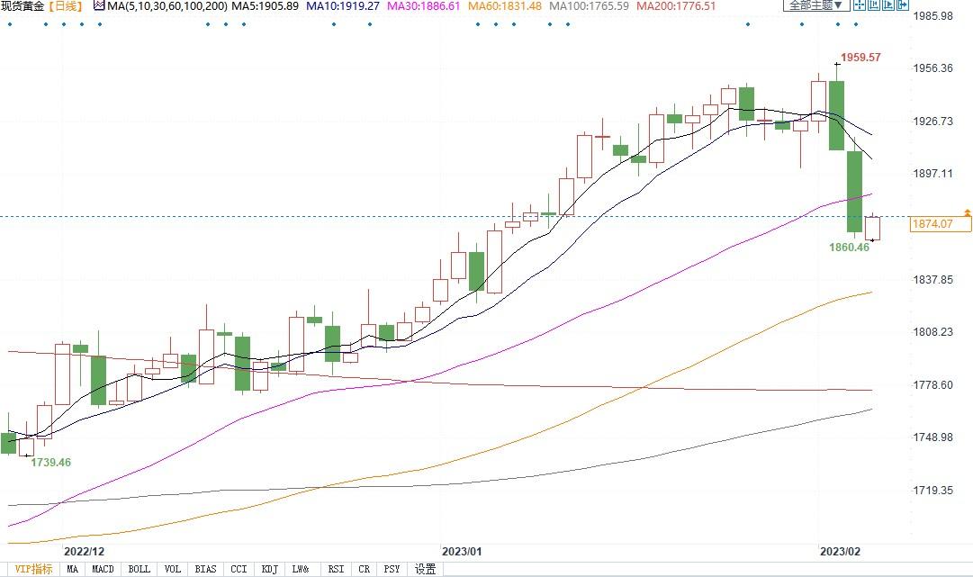 北京时间2月6日11:27,现货黄金报1874.05美元/盎司