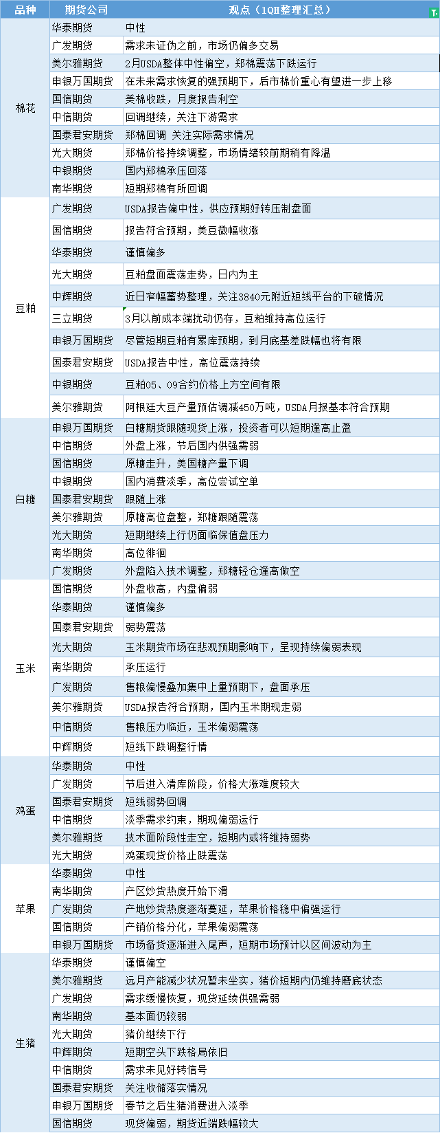 标题:期货公司观点汇总一张图:2月9日农产品(棉花、豆粕、白糖、玉米、鸡蛋、生猪等)