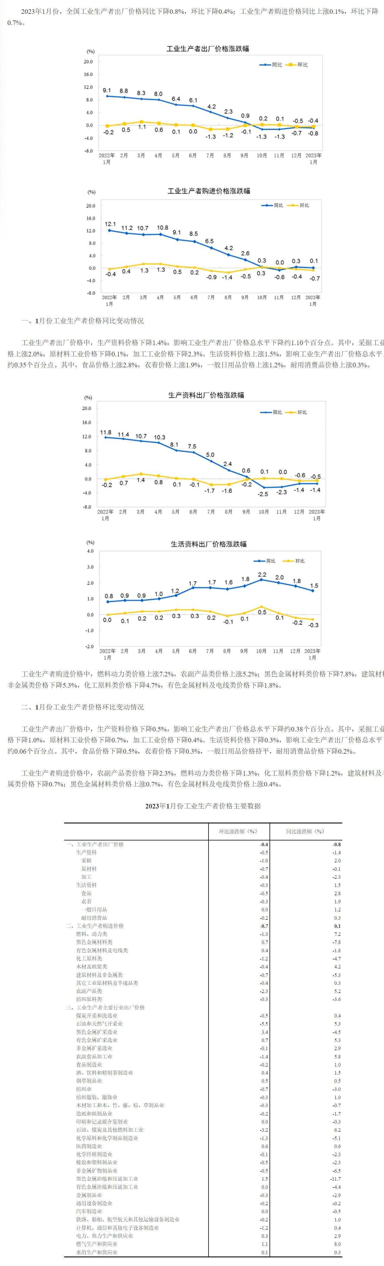 2023年1月份工业生产者出厂价格同比下降0.8%?环比下降0.4%