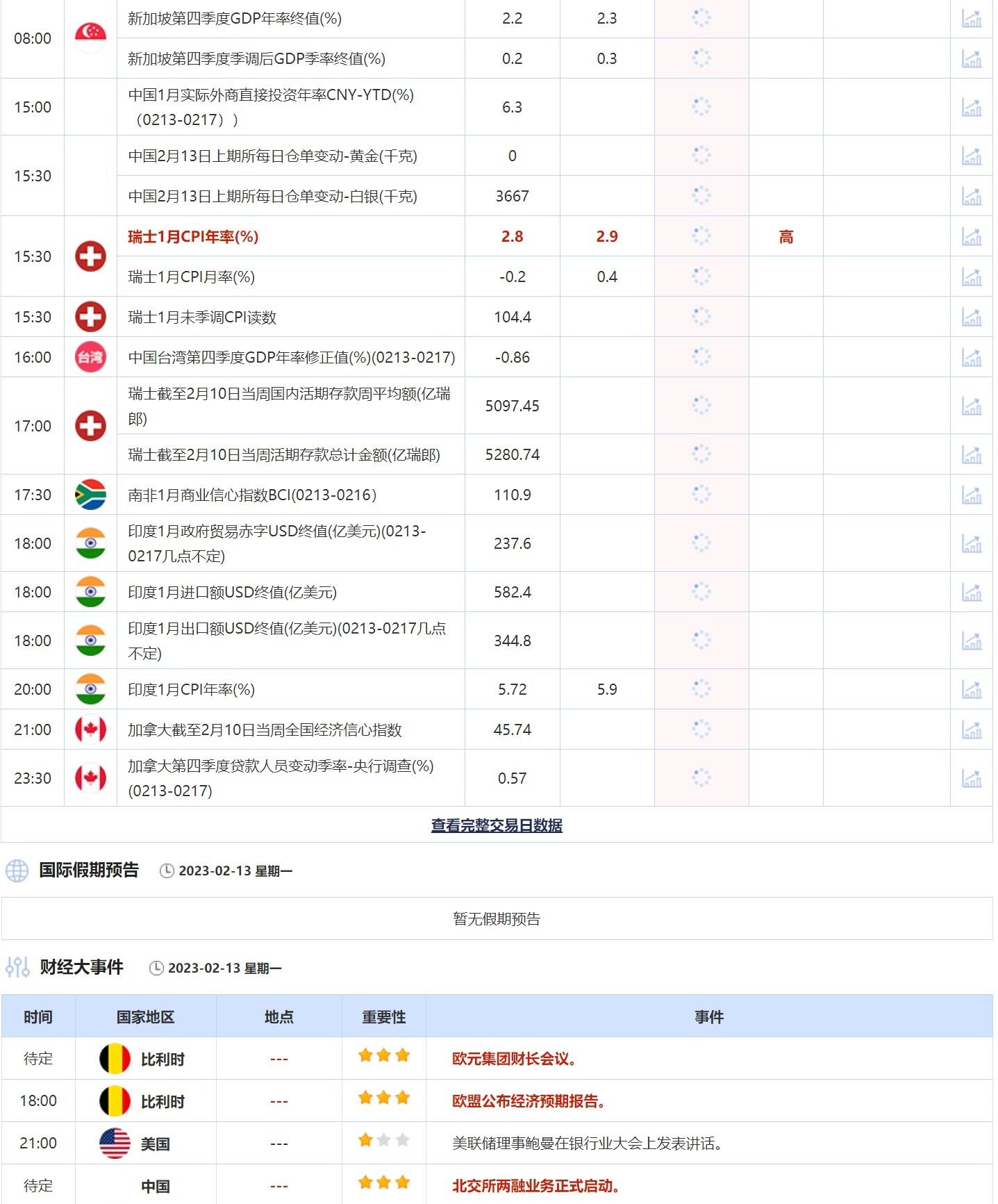15:30?瑞士1月CPI年率(%)?,?前值?2.8?,?预期值?2.9?,?公布值:待发布