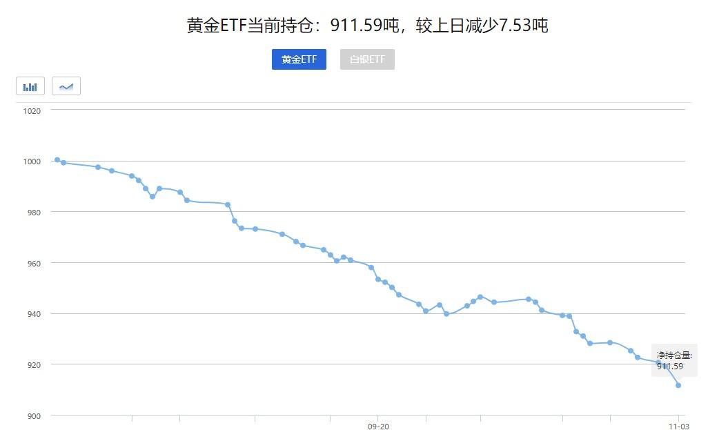11月4日黄金ETFs数据显示,截止11月3日全球最大的黄金ETF-SPDR?Gold?Trust的黄金持仓量911.59吨,较上一交易日减少3.48吨,为连续六个交易日下降,且再次刷新2020年3月20日以来新低。
