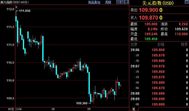 北京时间20:09,现货黄金下跌0.17%至1709.18美元/盎司;COMEX期金主力合约下跌0.22%至1712.3美元/盎司;美元指数上涨0.24%至109.888。