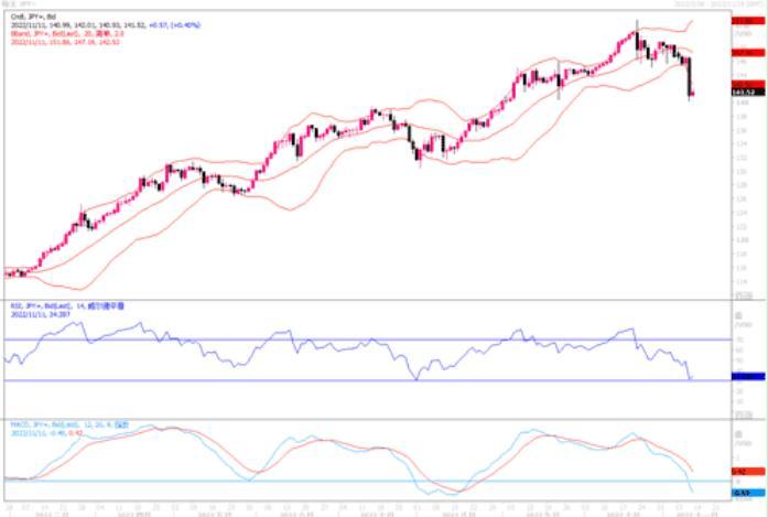 英镑兑美元周四将创下2017年1月以来的最大单日涨幅,达到3.24%高收盘于1.1723。影响的消息面主要是此前美国消费者价格涨幅度低于预期,为美联储放缓加息步伐铺平道路,CPI报告加剧了美元抛售势头。但是,周五英国国内生产总值(GDP)数据疲软的预期,以及数据显示英国10月房价在抵押贷款利率上升的情况下,市场上对于英国经济前景预期黯淡,英国央行上周警告称英国经济有可能连续两年衰退。因此,对于英镑的走势还是要保持谨慎态度。日线图上,英镑兑美元似有打破前期横盘区间倾向,但价格目前仍受压于120日均线(1.1800)下方,RSI走向均衡线上方,MACD信号线继续上扬,暂时英镑保持着多头的状态,若能冲破1.1820,上方目标区域瞄向1.20-1.22区域。下方的支撑留意1.1550-1.1500区域。