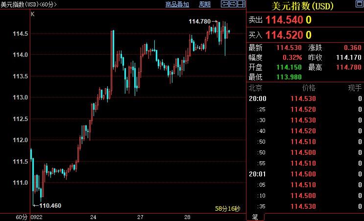 北京时间19:59,现货黄金下跌0.28%至1624.34美元/盎司;COMEX期金主力合约下跌0.25%至1632.1美元/盎司;美元指数上浮0.34%至114.528;英镑兑美元下跌1.33至1.0588。