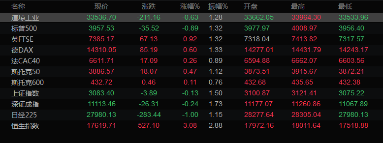 美股收盘情况:道琼斯工业指数下跌0.63%,报33536.7点,标普500指数下跌0.89%,报3957.25点。纳斯达克指数下跌1.12%,报11196.22点。