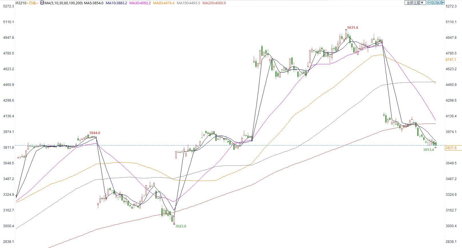 【今日行情】四大期指全线收跌。IH2210收盘价为2611.8,收跌0.18%;IF2210收盘价为3837.6,收跌0.12%;IC2210收盘价为5790.8,收涨0.01%;IM2210收盘价为6232.4,收跌0.13%。今日市场高开低走,午后加速走弱,上证综指创5月24日以来的新低至3026.08点。板块方面,煤炭、医药涨幅居前,消费者服务以及房地产跌逾2%。市场总成交额再创新低,缩至6256.45亿元,连续第9个交易日处于6000亿元的地量附近。