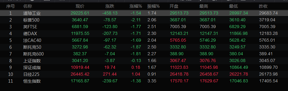 美股收盘情况:标普500指数下跌2.11%,收于3640.47点;纳斯达克指数下跌2.84%,至10737.51点;道琼斯工业指数下跌1.54%,至29225.61点。