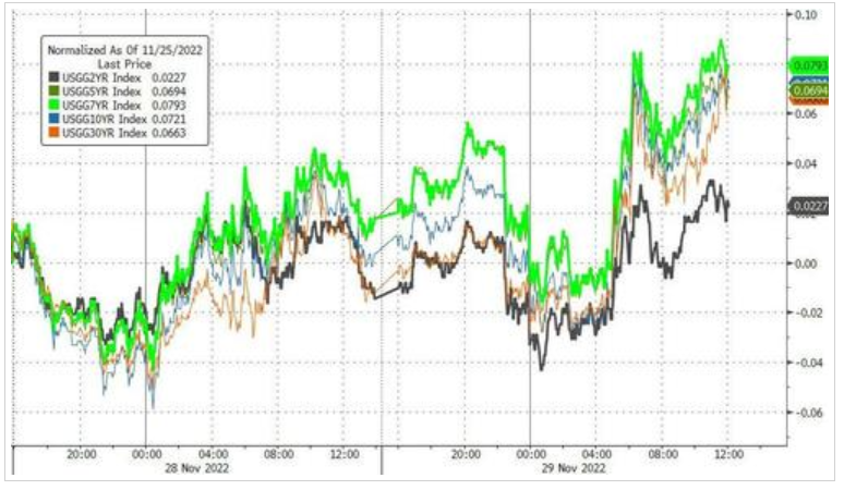 值得一提的是,随着本周以来发表讲话的多位美联储官员措辞普遍鹰派,利率市场的定价似乎也出现了不小的变动。芝商所的美联储观察工具显示,目前市场预计美联储在12月13日至14日的议息会议上加息50个基点的可能性降至了66%,而本月早些时候这一概率预期还曾处在80%以上。